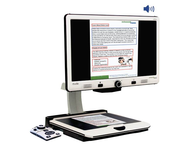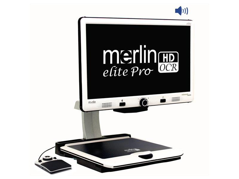 Merlin elite Pro es una lupa de escritorio de alto rendimiento con video (CCTV) que cuenta con una cámara Full HD 1080p y reconocimiento de texto a voz (OCR) de página completa. La cámara de alta definición de Merlin elite Pro muestra imágenes nítidas en colores vibrantes y contraste, mientras que su pantalla LCD de alta resolución y su amplio campo de visión producen el máximo detalle en una pantalla nítida y definida. Con solo presionar un botón, Merlin elite Pro le permite cambiar del modo de imagen en vivo al modo OCR de página completa para que lea en voz alta su artículo o libro favorito. Merlin elite Pro es una solución perfecta para cualquiera que busque una lupa electrónica todo en uno potente.